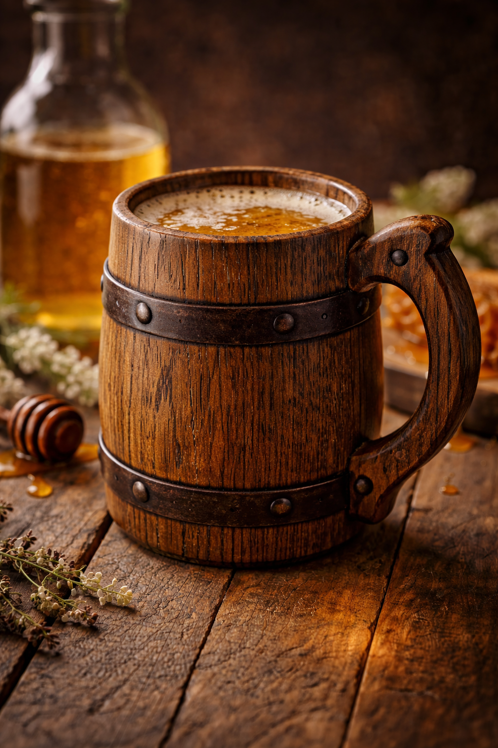 Handcrafted wooden cups offer an earthy feel, connecting you to mead’s ancient roots.